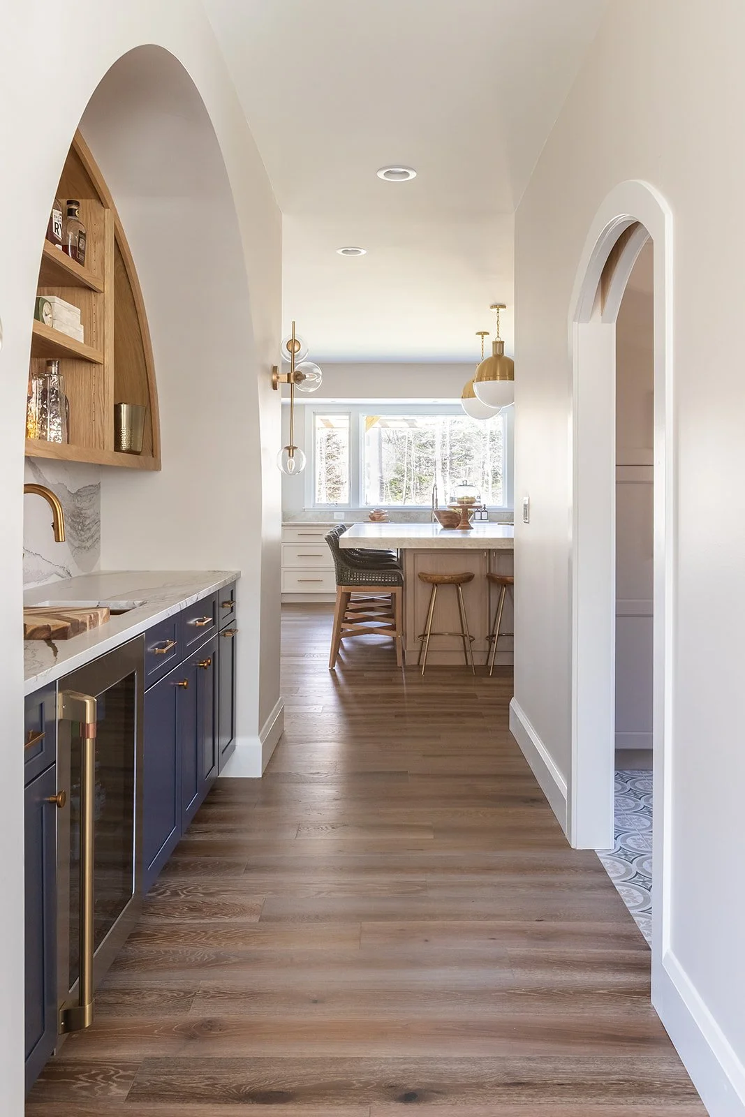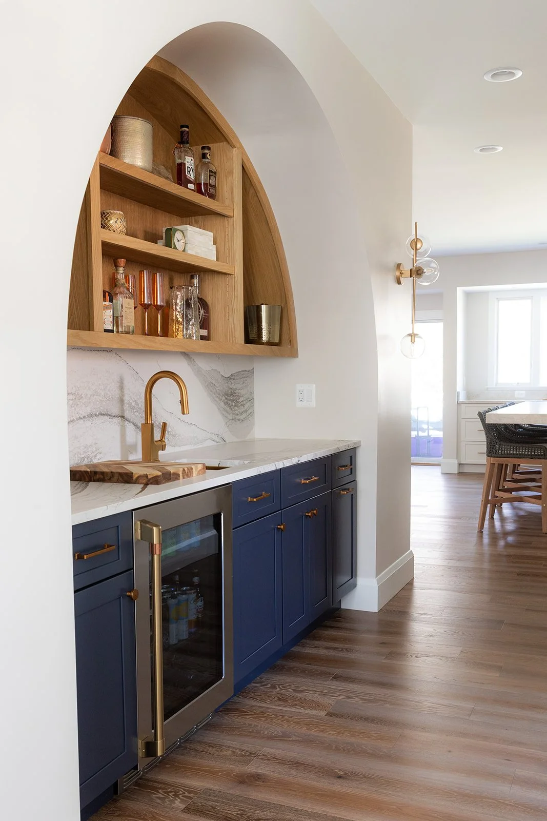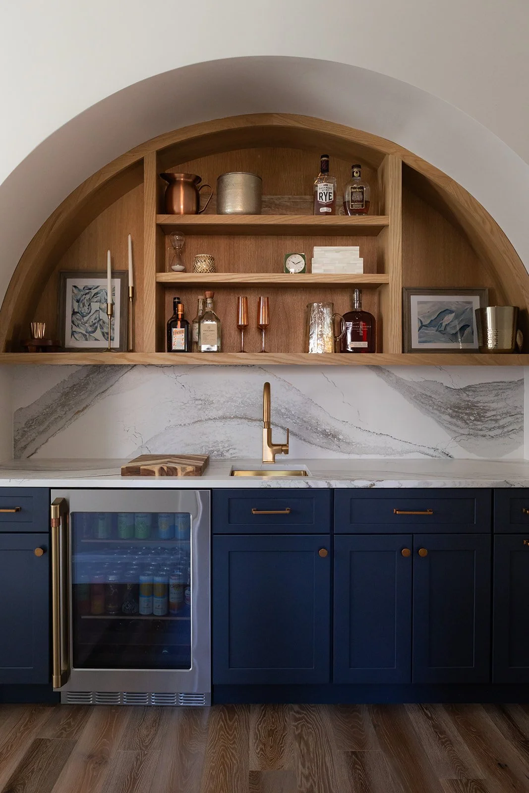 We split the underused sitting room into a butler’s pantry and hallway, giving way to the perfect nook for a beverage center. It is built into the wall, and the 9’ ceilings allowed us to create this beautiful arched detail. A bar sink, under cabinet refrigerator, and double trash pull out cabinet offer utility and the warm wood custom built in shelves display attractive drink ware.