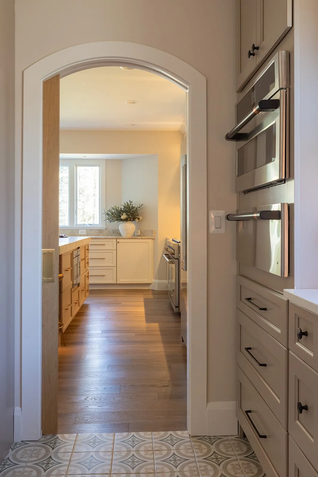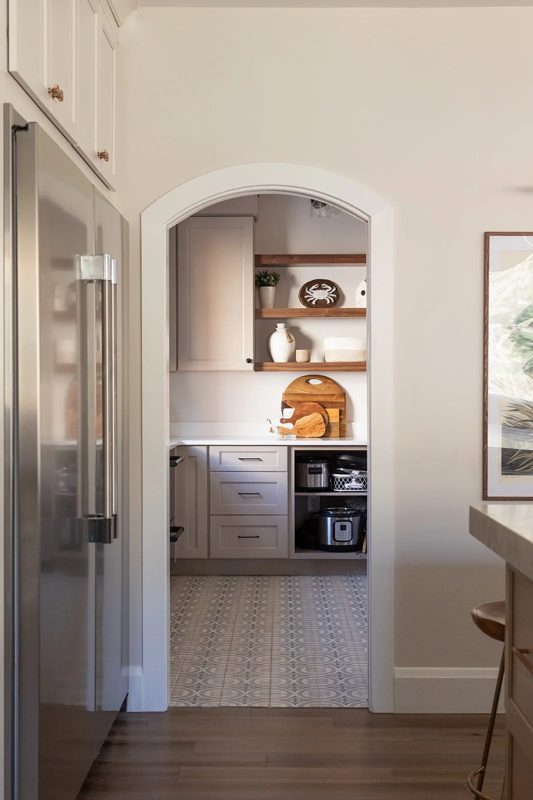 We utilized this underused sitting room for an incredible butler’s pantry space in Shipley’s. We added an ice maker, refrigerator drawers, an extra dishwasher, a steam oven, and an extra oven. Floor to ceiling pantries and wall cabinets offer plenty of storage, a the prep sink and open shelves add utility. And we did it all with creamy stone cabinetry, glass, and natural walnut to keep the space warm and welcoming. This is THE pantry.
